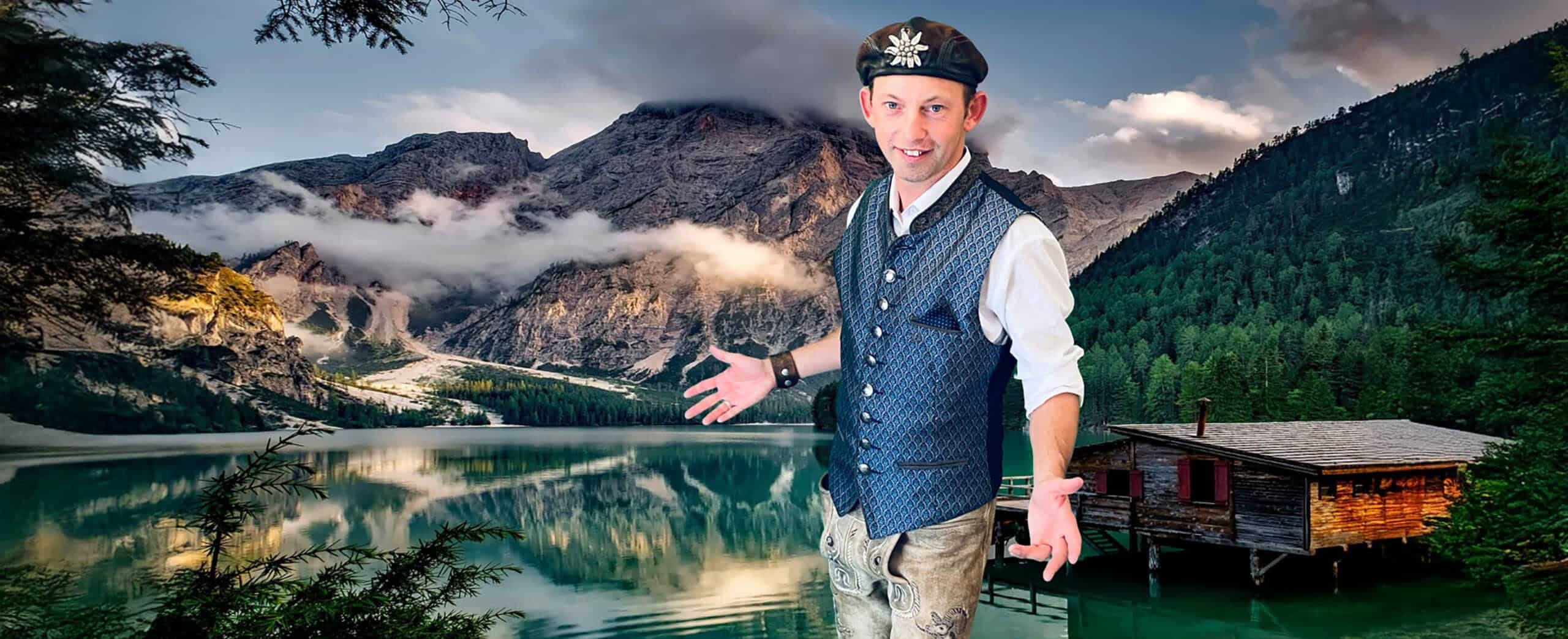 Mit Kappe, Edelweiß und einem Grinser, der sogar den Grantler zum Schunkeln bringt.